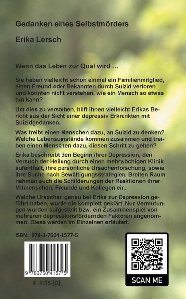 Wenn das Leben zur Qual wird.Sie haben vielleicht schon einmal ein Familienmitglied, einen Freund oder Bekannten durch Suizid verloren und konnten nicht verstehen, wie ein Mensch so etwas tun kann?Um dies zu verstehen, hilft ihnen vielleicht Erikas Bericht aus der Sicht einer depressiv Erkrankten mit Suizidgedanken.Was treibt einen Menschen dazu, an Suizid zu denken? Welche Lebensumstände kommen zusammen und treiben einen Menschen dazu, diesen Schritt zu gehen?Erika beschreibt den Beginn ihrer Depression, den Versuch der Heilung durch einen mehrwöchigen Klinikaufenthalt, ihre persönliche Ursachenforschung sowie ihre Suche nach Bewältigungsstrategien. Breiten Raum nehmen auch die Schilderungen der Reaktionen ihrer Mitmenschen, Freunde und Kollegen ein.Welche Ursachen genau bei Erika zur Depression geführt haben, wurde nie komplett geklärt. Nur Vermutungen wurden aufgestellt bzw. ein Zusammenspiel von mehreren depressionsfördernden Faktoren angenommen. Diese werden im Einzelnen erläutert.