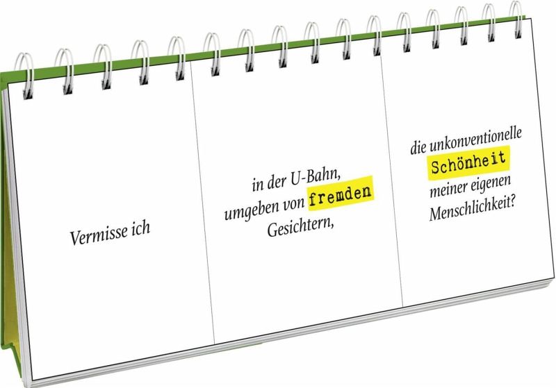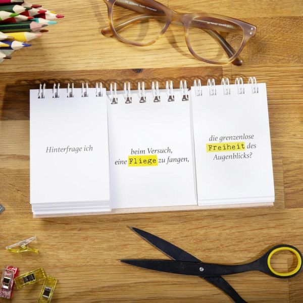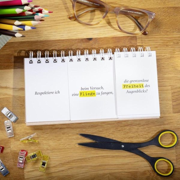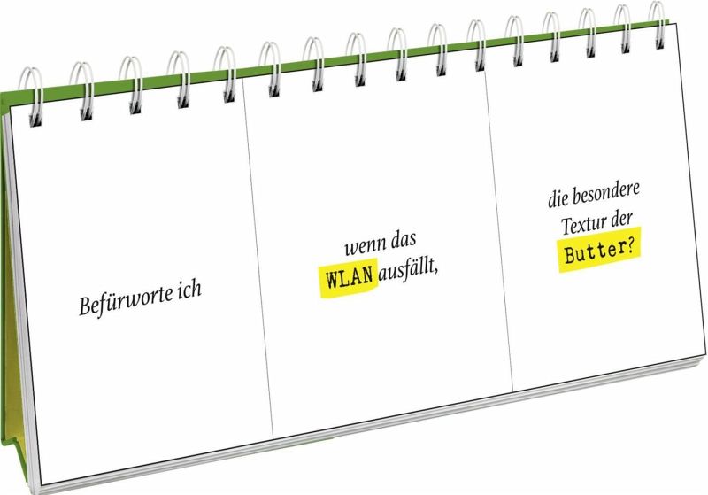 Mit mehr als 125.000 möglichen Fragekombinationen bietet unser Spiralaufsteller eine Fülle von augenzwinkernden Denkanstößen. Lass dich von unerwarteten Fragen zu neuen Erkenntnissen führen und entdecke, wie viel Spaß Selbstreflexion machen kann.