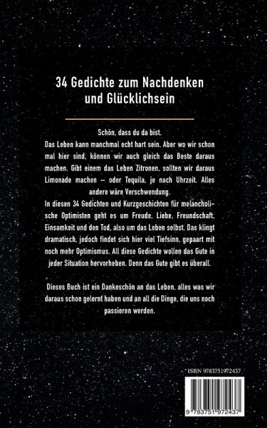 34 Gedichte zum Nachdenken und GlücklichseinSchön, dass du da bist. Das Leben kann manchmal echt hart sein. Aber wo wir schon mal hier sind, können wir auch gleich das Beste daraus machen. Gibt einem das Leben Zitronen, sollten wir daraus Limonade machen - oder Tequila, je nach Uhrzeit. Alles andere wäre Verschwendung. In diesen 34 Gedichten und Gedanken für melancholische Optimisten geht es um Freude, Liebe, Freundschaft, Einsamkeit und den Tod, also um das Leben selbst. Das klingt dramatisch, jedoch findet sich hier viel Tiefsinn, gepaart mit noch mehr Optimismus. All diese Gedichte wollen das Gute in jeder Situation hervorheben. Denn das Gute gibt es überall.Dieses Buch ist ein Dankeschön an das Leben, alles was wir daraus gelernt haben und an all die Dinge, die uns noch passieren werden.