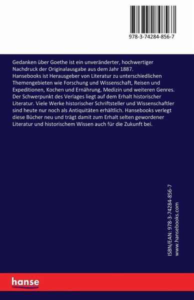 Gedanken über Goethe ist ein unveränderter, hochwertiger Nachdruck der Originalausgabe aus dem Jahr 1887.