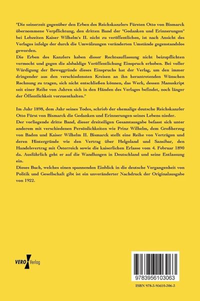 "Die seinerzeit gegenüber den Erben des Reichskanzlers Fürsten Otto von Bismarck übernommene Verpflichtung, den dritten Band der "Gedanken und Erinnerungen" bei Lebzeiten Kaiser Wilhelm's II. nicht zu veröffentlichen, ist nach Ansicht des Verlages infolge der durch die Umwälzungen veränderten Umstände gegenstandslos geworden.