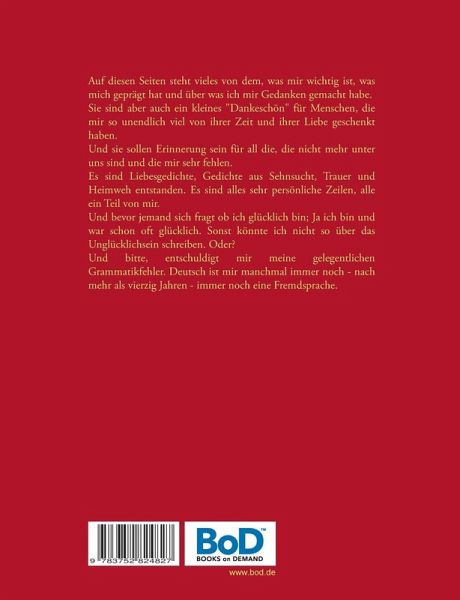 Auf diesen Seiten steht vieles von dem, was mir wichtig ist, was mich geprägt hat und über was ich mir Gedanken gemacht habe.Sie sind aber auch ein kleines "Dankeschön" für Menschen, die mir so unendlich viel von ihrer Zeit und ihrer Liebe geschenkt haben.Und sie sollen Erinnerung sein für all die, die nicht mehr unter uns sind und die mir sehr fehlen.Es sind Liebesgedichte, Gedichte aus Sehnsucht, Trauer und Heimweh entstanden. Es sind alles sehr persönliche Zeilen, alle ein Teil von mir.Und bevor jemand sich fragt ob ich glücklich bin; Ja ich bin und war schon oft glücklich. Sonst könnte ich nicht so über das Unglücklichsein schreiben. Oder?Und bitte, entschuldigt mir meine gelegentlichen Grammatikfehler. Deutsch ist mir manchmal - nach mehr als vierzig Jahren - immer noch eine Fremdsprache.