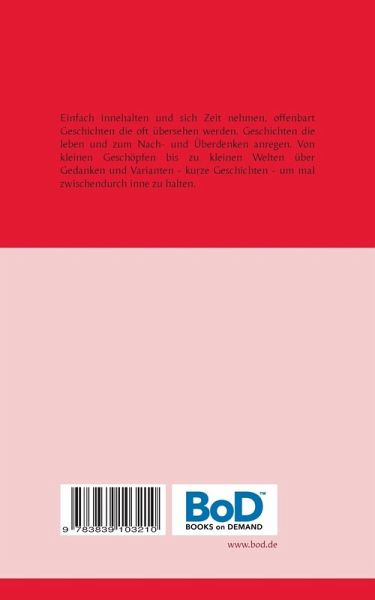 Einfach innehalten und sich Zeit nehmen, offenbart Geschichten die oft übersehen werden. Geschichten die leben und zum Nach- und Überdenken anregen. Von kleinen Geschöpfen bis zu kleinen Welten über Gedanken und Varianten - kurze Geschichten - um mal zwischendurch inne zu halten.