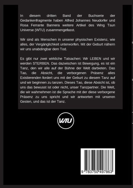 In diesem dritten Band der Buchserie der Gedankenfragmente haben Alfred Johannes Neudorfer und Rosa Ferrante Bannera weitere Artikel des Wing Tsun Universe (WTU) zusammengefasst. Wir sind als Menschen in unserer physischen Existenz, wie alles, der Vergänglichkeit unterworfen. Mit der Geburt nähern wir uns unabdingbar dem Tod.Es gibt nur zwei wirkliche Tatsachen: Wir LEBEN und wir werden STERBEN. Das dazwischen ist Bewegung, es ist ein Tanz, den wir alle auf der Bühne der Welt darbieten. Das Tao, die Absicht, die verborgenen Präsenz alles Existierenden fordert uns mit der Geburt zu diesem Tanz auf und wir beginnen zu tanzen. Dieses Tao, diese Absicht ist, ob uns das bewusst ist oder nicht, unser Tanzpartner. Die Welt, die wir wahrnehmen ist die Sprache mit der diese verborgene Präsenz zu uns spricht und wir antworten mit unseren Gesten, und das ist der Tanz.
