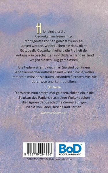 Hier sind sie: die Gedanken im freien Flug. Mobilgeräte können getrost zurückgelassen werden, wir brauchen sie dazu nicht. Es lebe die Gedankenfreiheit, die Freiheit der Fantasie - in Geschichten und Bildern. Hand in Hand wagen sie den Flug gemeinsam.Die Gedanken sind doch frei. Sie sind von ihrem Gedankenmacher entlassen und wissen nicht, wohin. Immerhin müssen sie kaum jemanden fürchten, weil sie durchweg unerkannt bleiben.(Ulli Harth)Die Worte, zum ersten Mal gelesen, sinken ein in die Struktur des Papiers; nach einer Weile tauchen die Figuren der Geschichte daraus auf, geweckt von Feder, Tusche und Farben.(Dietmar Schwenck)