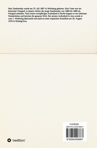 Max Dauthendey wurde am 25. Juli 1867 in Würzburg geboren. Sein Vater war ein bekannter Fotograf, in dessen Atelier der junge Dauthendey von 1886 bis 1889 als Fotograf arbeitete. Nach einem zweijährigen Aufenthalt in Berlin begann er ein ruheloses Wanderleben und bereiste die gesamte Welt. Bei seinem Aufenthalt in Java wurde er vom 1. Weltkrieg überrascht und starb an einer tropischen Krankheit am 29. August 1918 in Malang/Java.