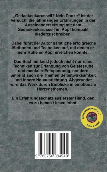 "Gedankenkarussell? Nein Danke" ist der Versuch, die jahrelangen Erfahrungen in der Auseinandersetzung mit dem Gedankenkarussell im Kopf kompakt niederzuschreiben. Dabei führt der Autor sämtliche erfolgreiche Methoden und Techniken auf, mit denen er mehr Ruhe im Kopf erreichen konnte. Das Buch umfasst jedoch nicht nur reine Techniken zur Erlangung von Geistesruhe und mentaler Entspannung, sondern umreißt auch die Themen Selbstwirksamkeit und innere Neuausrichtung. Abgerundet wird das Werk durch Einblicke in emotionale Herzensthemen. Ein Erfahrungsschatz aus erster Hand, den es zu heben / lesen lohnt.