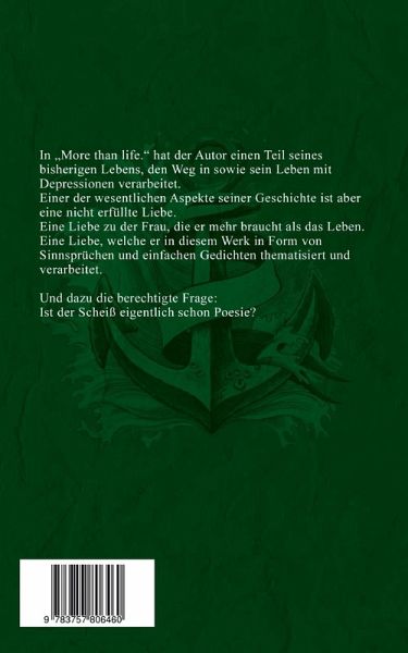 In "More than life." hat der Autor einen Teil seines bisherigen Lebens, den Weg in sowie sein Leben mit Depressionen verarbeitet. Einer der wesentlichen Aspekte seiner Geschichte ist aber eine nicht erfüllte Liebe. Eine Liebe zu der Frau, die er mehr braucht als das Leben. Eine Liebe, welche er in diese Werk in Form von Sinnsprüchen und einfachen Gedichten thematisiert und verarbeitet.Und dazu die berechtigte Frage:Ist der Scheiß eigentlich schon Poesie?