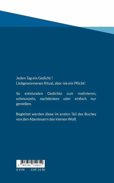 Jeden Tag ein Gedicht !Liebgewonnenes Ritual, aber nie eine Pflicht!So entstanden Gedichte zum motivieren, schmunzeln, nachdenken oder einfach nur genießen.Begleitet werden diese im ersten Teil des Buches von den Abenteuern des kleinen Wolf.