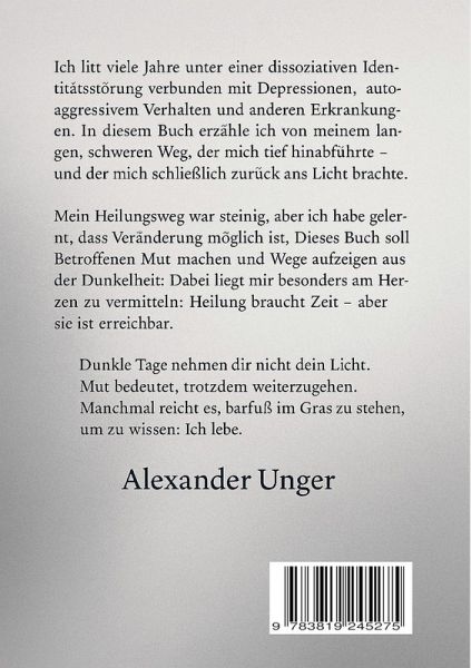 Ein ehrlicher Erfahrungsbericht mit psychologischem Tiefgang und praktischen Hilfestellungen für Betroffene, Angehörige und Interessierte. Ich spreche in meinem Buch offen über meine Erfahrungen mit Depression, PTBS, Autoaggression und einer dissoziativen Identitätsstruktur. Nicht als Fachmann, sondern als Mensch, der über 27 Jahre selbst betroffen war. Dieses Buch ist meine Geschichte. Es ist ehrlich, schonungslos und voller Tiefe. Aber es ist auch mehr: Ein Wegweiser. Ein Mutmacher. Ein Anker.