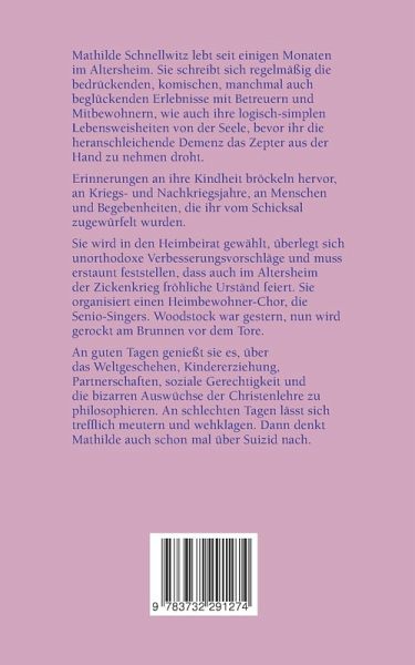 Mathilde Schnellwitz lebt seit einigen Monaten im Altersheim. Sie schreibt sich regelmäßig die bedrückenden, komischen, manchmal auch beglückenden Erlebnisse mit Betreuern und Mitbewohnern, wie auch ihre logisch-simplen Lebensweisheiten von der Seele, bevor ihr die heranschleichende Demenz das Zepter aus der Hand zu nehmen droht.Erinnerungen an ihre Kindheit bröckeln hervor, an Kriegs- und Nachkriegsjahre, an Menschen und Begebenheiten, die ihr vom Schicksal zugewürfelt wurden.Sie wird in den Heimbeirat gewählt, überlegt sich unorthodoxe Verbesserungsvorschläge und muss erstaunt feststellen, dass auch im Altersheim der Zickenkrieg fröhliche Urständ feiert. Sie organisiert einen Heimbewohner-Chor, die Senio-Singers. Woodstock war gestern, nun wird gerockt am Brunnen vor dem Tore. An guten Tagen genießt sie es, über das Weltgeschehen, Kindererziehung, Partnerschaften, soziale Gerechtigkeit und die bizarren Auswüchse der Christenlehre zu philosophieren. An schlechten Tagen lässt sich trefflich meutern und wehklagen. Dann denkt Mathilde auch schon mal über Suizid nach.