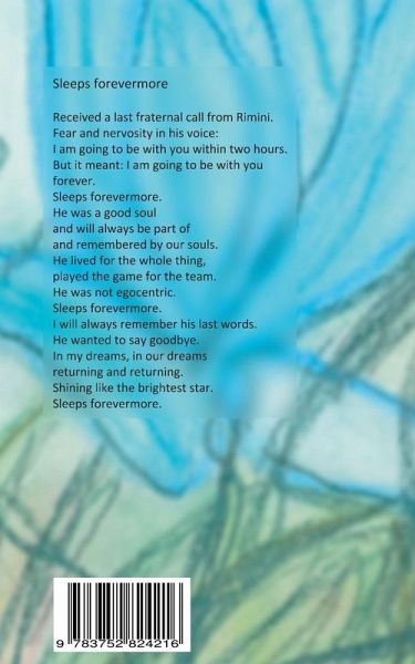 Sleeps forevermoreReceived a last fraternal call from Rimini. Fear and nervosity in his voice:I am going to be with you within two hours.But it meant: I am going to be with youforever.Sleeps forevermore.He was a good souland will always be part ofand remembered by our souls.He lived for the whole thing,played the game for the team.He was not egocentric.Sleeps forevermore.I will always remember his last words.He wanted to say goodbye.In my dreams, in our dreamsreturning and returning.Shining like the brightest star.Sleeps forevermore.