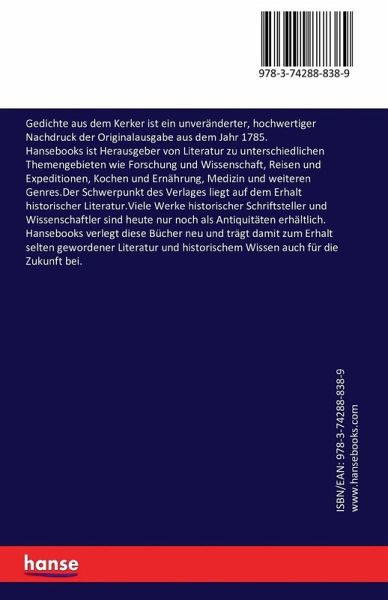 Gedichte aus dem Kerker ist ein unveränderter, hochwertiger Nachdruck der Originalausgabe aus dem Jahr 1785.