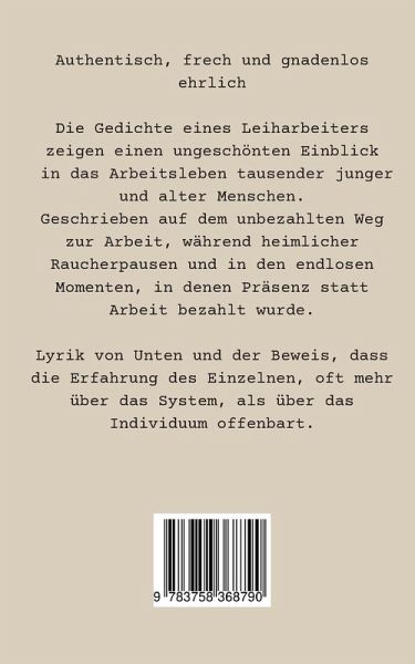Authentisch, frech und gnadenlos ehrlichDie Gedichte eines Leiharbeiters zeigen einen ungeschönten Einblick in das Arbeitsleben tausender junger und alter Menschen.Geschrieben auf dem unbezahlten Weg zur Arbeit, während heimlicher Raucherpausen und in den endlosen Momenten, in denen Präsenz statt Arbeit bezahlt wurde. Lyrik von Unten und der Beweis, dass die Erfahrung des Einzelnen, oft mehr über das System, als über das Individuum offenbart.