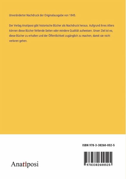 Unveränderter Nachdruck der Originalausgabe von 1845. Der Verlag Anatiposi gibt historische Bücher als Nachdruck heraus. Aufgrund ihres Alters können diese Bücher fehlende Seiten oder mindere Qualität aufweisen. Unser Ziel ist es, diese Bücher zu erhalten und der Öffentlichkeit zugänglich zu machen, damit sie nicht verloren gehen.