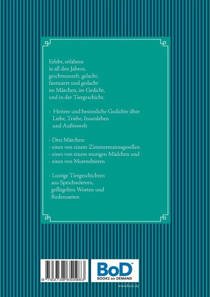 Erlebt, erfahrenin all den Jahren,geschmunzelt, gelacht, fantasiert und gedachtim Märchen, im Gedicht,und in der Tiergeschicht.- Heitere und besinnliche Gedichte über Liebe, Triebe, Innenleben und Außenwelt- Drei Märchen: eins von einem Zimmermannsgesellen, eines von einem mutigen Mädchen und eines von Murmeltieren- lustige Tiergeschichten aus Sprichwörtern, geflügelten Worten und Redensarten