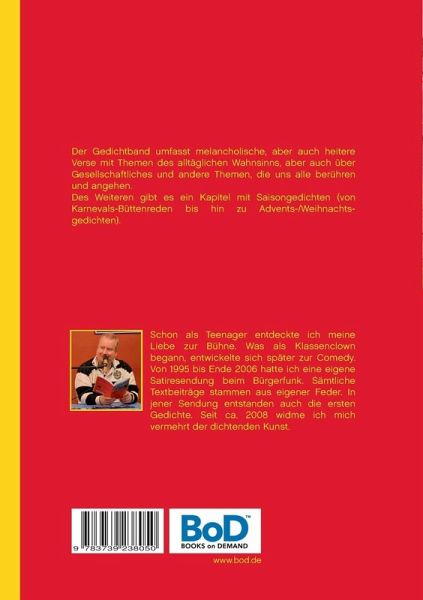 Der Gedichtband umfasst melancholische, aber auch heitere Verse mit Themen des alltäglichen Wahnsinns, aber auch über Gesellschaftliches und andere Themen, die uns alle berühren und angehen.Des Weiteren gibt es ein Kapitel mit Saisongedichten (von Karnevals-Büttenreden bis hin zu Advents-/Weihnachtsgedichten).