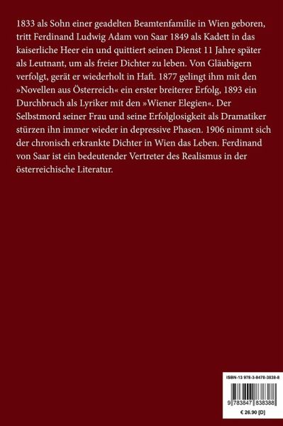 Ferdinand von Saar: Gedichte / Wiener Elegien Lesefreundlicher Großdruck in 16-pt-Schrift Großformat, 210 x 297 mm Berliner Ausgabe, 2019 Durchgesehener Neusatz mit einer Biographie des Autors bearbeitet und eingerichtet von Theodor Borken Gedichte: Erstdruck der Gedichte: Heidelberg 1882. Der vorliegende Text folgt der 2., vermehrten Auflage: Heidelberg (Georg Weiß) 1888. Wiener Elegien: Vorliegendem Text liegt der Erstdruck zugrunde: Wiener Elegien, Heidelberg (Georg Weiß) 1893. Textgrundlage sind die Ausgaben: Ferdinand von Saar: Gedichte, Heidelberg, (2) 1888. Ferdinand von Saar: Wiener Elegien, Heidelberg 1893. Dieses Buch folgt in Rechtschreibung und Zeichensetzung obiger Textgrundlage. Umschlaggestaltung von Thomas Schultz-Overhage unter Verwendung des Bildes: Ferdinand Saar (Photographie von Charles Scolik jun.). Gesetzt aus der Minion Pro, 16 pt. Über den Autor: 1833 als Sohn einer geadelten Beamtenfamilie in Wien geboren, tritt Ferdinand Ludwig Adam von Saar 1849 als Kadett in das kaiserliche Heer ein und quittiert seinen Dienst 11 Jahre später als Leutnant, um als freier Dichter zu leben. Von Gläubigern verfolgt, gerät er wiederholt in Haft. 1877 gelingt ihm mit den »Novellen aus Österreich« ein erster breiterer Erfolg, 1893 ein Durchbruch als Lyriker mit den »Wiener Elegien«. Der Selbstmord seiner Frau und seine Erfolglosigkeit als Dramatiker stürzen ihn immer wieder in depressive Phasen. 1906 nimmt sich der chronisch erkrankte Dichter in Wien das Leben. Ferdinand von Saar ist ein bedeutender Vertreter des Realismus in der österreichische Literatur.