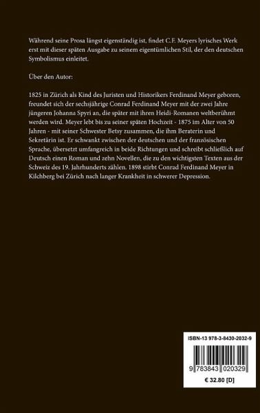 Conrad Ferdinand Meyer: Gedichte. Ausgabe 1892 Während seine Prosa längst eigenständig ist, findet C.F. Meyers lyrisches Werk erst mit dieser späten Ausgabe zu seinem eigentümlichen Stil, der den deutschen Symbolismus einleitet. Ausgabe letzter Hand: Gedichte von Conrad Ferdinand Meyer. Fünfte vermehrte Auflage, Leipzig (H. Haessel) 1892. ¿ Die Gedichte entstanden zwischen 1860 und 1892. Vollständige Neuausgabe mit einer Biographie des Autors. Herausgegeben von Karl-Maria Guth. Berlin 2013. Textgrundlage ist die Ausgabe: Conrad Ferdinand Meyer: Sämtliche Werke in zwei Bänden. Vollständiger Text nach den Ausgaben letzter Hand. Mit einem Nachwort von Erwin Laaths, München: Winkler, 1968. Die Paginierung obiger Ausgabe wird in dieser Neuausgabe als Marginalie zeilengenau mitgeführt. Umschlaggestaltung von Thomas Schultz-Overhage unter Verwendung des Bildes: Conrad Ferdinand Meyer (Fotografie von C. Ruf in Zürich, nicht datiert). Gesetzt aus Minion Pro, 11 pt. Über den Autor: 1825 in Zürich als Kind des Juristen und Historikers Ferdinand Meyer geboren, freundet sich der sechsjährige Conrad Ferdinand Meyer mit der zwei Jahre jüngeren Johanna Spyri an, die später mit ihren Heidi-Romanen weltberühmt werden wird. Meyer lebt bis zu seiner späten Hochzeit - 1875 im Alter von 50 Jahren - mit seiner Schwester Betsy zusammen, die ihm Beraterin und Sekretärin ist. Er schwankt zwischen der deutschen und der französischen Sprache, übersetzt umfangreich in beide Richtungen und schreibt schließlich auf Deutsch einen Roman und zehn Novellen, die zu den wichtigsten Texten aus der Schweiz des 19. Jahrhunderts zählen. 1898 stirbt Conrad Ferdinand Meyer in Kilchberg bei Zürich nach langer Krankheit in schwerer Depression.