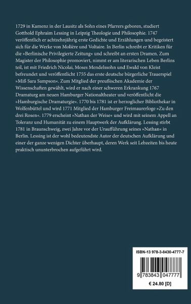 Gotthold Ephraim Lessing: Gedichte Lieder (Ausgabe 1771): Eine Sammlung von Liedern veröffentlichte Lessing bereits 1751 unter dem Titel »Kleinigkeiten«, Berlin (Voss), und dann etwas verändert in den »Schriften«, Berlin (Voss) 1753. Die vorliegende letzte Fassung dieser Sammlung erschien im 1. Band der »Vermischten Schriften«, Berlin (Voss) 1771. Oden (Ausgabe 1771): Die ersten acht, zunächst in Zeitschriften veröffentlichten Oden erschienen als Sammlung zuerst im 1. Teil der »Schriften«, Berlin (Voss) 1753. Vermehrt um die neunte Ode erschien die Sammlung erneut im 2. Teil der »Vermischten Schriften«, Berlin (Voss), der bereits 1771 gedruckt, aber erst 1784 ausgeliefert wurde. Sinngedichte (Ausgabe 1771): Eine erste Sammlung von Epigrammen veröffentlichte Lessing im 1. Teil seiner »Schriften«, Berlin (Voss) 1753. Die vorliegende, stark erweiterte Sammlung erschien im 1. Band der »Vermischten Schriften«, Berlin (Voss) 1771. Sinngedichte (Nachlese): Die Nachlese umfaßt Epigramme, die Lessing nicht in die Sammlung von 1771 aufnahm, einzeln publizierte Epigramme sowie solche, die erst aus dem Nachlaß veröffentlicht wurden. Vollständige Neuausgabe mit einer Biographie des Autors. Herausgegeben von Karl-Maria Guth. Berlin 2014. Textgrundlage ist die Ausgabe: Gotthold Ephraim Lessing: Werke. Herausgegeben von Herbert G. Göpfert in Zusammenarbeit mit Karl Eibl, Helmut Göbel, Karl S. Guthke, Gerd Hillen, Albert von Schirmding und Jörg Schönert, Band 1¿8, München: Hanser, 1970 ff. Die Paginierung obiger Ausgabe wird in dieser Neuausgabe als Marginalie zeilengenau mitgeführt. Umschlaggestaltung von Thomas Schultz-Overhage. Gesetzt aus Minion Pro, 11 pt. Über den Autor: 1729 in Kamenz in der Lausitz als Sohn eines Pfarrers geboren, studiert Gotthold Ephraim Lessing in Leipzig Theologie und Philosophie. 1747 veröffentlich er achtzehnjährig erste Gedichte und Erzählungen und begeistert sich für die Werke von Molière und Voltaire. In Berlin schreibt er Kritiken für die »Berlinische Privilegierte Zeitung« und schreibt an ersten Dramen. Zum Magister der Philosophie promoviert, nimmt er am literarischen Leben Berlins teil, ist mit Friedrich Nicolai, Moses Mendelssohn und Ewald von Kleist befreundet und veröffentlicht 1755 das erste deutsche bürgerliche Trauerspiel »Miß Sara Sampson«. Zum Mitglied der preußischen Akademie der Wissenschaften gewählt, wird er nach einer schweren Erkrankung 1767 Dramaturg am neuen Hamburger Nationaltheater und veröffentlicht die »Hamburgische Dramaturgie«. 1770 bis 1781 ist er herzoglicher Bibliothekar in Wolfenbüttel und wird 1771 Mitglied der Hamburger Freimaurerloge »Zu den drei Rosen«. 1779 erscheint »Nathan der Weise« und wird mit seinem Appell an Toleranz und Humanität zu einem Hauptwerk der Aufklärung. Lessing stirbt 1781 in Braunschweig, zwei Jahre vor der Uraufführung seines »Nathan« in Berlin. Lessing ist der wohl bedeutendste Autor der deutschen Aufklärung und einer der ganze wenigen Dichter überhaupt, deren Werk seit Lebzeiten bis heute praktisch ununterbrochen aufgeführt wird.