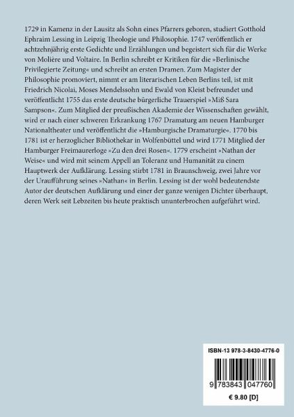 Gotthold Ephraim Lessing: Gedichte Lieder (Ausgabe 1771): Eine Sammlung von Liedern veröffentlichte Lessing bereits 1751 unter dem Titel »Kleinigkeiten«, Berlin (Voss), und dann etwas verändert in den »Schriften«, Berlin (Voss) 1753. Die vorliegende letzte Fassung dieser Sammlung erschien im 1. Band der »Vermischten Schriften«, Berlin (Voss) 1771. Oden (Ausgabe 1771): Die ersten acht, zunächst in Zeitschriften veröffentlichten Oden erschienen als Sammlung zuerst im 1. Teil der »Schriften«, Berlin (Voss) 1753. Vermehrt um die neunte Ode erschien die Sammlung erneut im 2. Teil der »Vermischten Schriften«, Berlin (Voss), der bereits 1771 gedruckt, aber erst 1784 ausgeliefert wurde. Sinngedichte (Ausgabe 1771): Eine erste Sammlung von Epigrammen veröffentlichte Lessing im 1. Teil seiner »Schriften«, Berlin (Voss) 1753. Die vorliegende, stark erweiterte Sammlung erschien im 1. Band der »Vermischten Schriften«, Berlin (Voss) 1771. Sinngedichte (Nachlese): Die Nachlese umfaßt Epigramme, die Lessing nicht in die Sammlung von 1771 aufnahm, einzeln publizierte Epigramme sowie solche, die erst aus dem Nachlaß veröffentlicht wurden. Vollständige Neuausgabe mit einer Biographie des Autors. Herausgegeben von Karl-Maria Guth. Berlin 2014. Textgrundlage ist die Ausgabe: Gotthold Ephraim Lessing: Werke. Herausgegeben von Herbert G. Göpfert in Zusammenarbeit mit Karl Eibl, Helmut Göbel, Karl S. Guthke, Gerd Hillen, Albert von Schirmding und Jörg Schönert, Band 1¿8, München: Hanser, 1970 ff. Die Paginierung obiger Ausgabe wird in dieser Neuausgabe als Marginalie zeilengenau mitgeführt. Umschlaggestaltung von Thomas Schultz-Overhage. Gesetzt aus Minion Pro, 11 pt. Über den Autor: 1729 in Kamenz in der Lausitz als Sohn eines Pfarrers geboren, studiert Gotthold Ephraim Lessing in Leipzig Theologie und Philosophie. 1747 veröffentlich er achtzehnjährig erste Gedichte und Erzählungen und begeistert sich für die Werke von Molière und Voltaire. In Berlin schreibt er Kritiken für die »Berlinische Privilegierte Zeitung« und schreibt an ersten Dramen. Zum Magister der Philosophie promoviert, nimmt er am literarischen Leben Berlins teil, ist mit Friedrich Nicolai, Moses Mendelssohn und Ewald von Kleist befreundet und veröffentlicht 1755 das erste deutsche bürgerliche Trauerspiel »Miß Sara Sampson«. Zum Mitglied der preußischen Akademie der Wissenschaften gewählt, wird er nach einer schweren Erkrankung 1767 Dramaturg am neuen Hamburger Nationaltheater und veröffentlicht die »Hamburgische Dramaturgie«. 1770 bis 1781 ist er herzoglicher Bibliothekar in Wolfenbüttel und wird 1771 Mitglied der Hamburger Freimaurerloge »Zu den drei Rosen«. 1779 erscheint »Nathan der Weise« und wird mit seinem Appell an Toleranz und Humanität zu einem Hauptwerk der Aufklärung. Lessing stirbt 1781 in Braunschweig, zwei Jahre vor der Uraufführung seines »Nathan« in Berlin. Lessing ist der wohl bedeutendste Autor der deutschen Aufklärung und einer der ganze wenigen Dichter überhaupt, deren Werk seit Lebzeiten bis heute praktisch ununterbrochen aufgeführt wird.