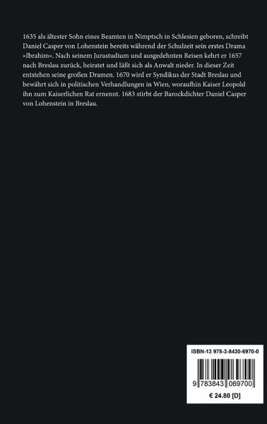 Daniel Casper von Lohenstein: Gedichte Lohensteins Gedichte erschienen meist zuerst in Einzeldrucken und wurden dann gesammelt in dem Band »Blumen«, Breslau 1680, herausgegeben. Einige der hier ausgewählten Gedichte sind erstmals posthum in Bd. 1 der Neukirch-Anthologie (1695) veröffentlicht worden, einige sind den Trauerspielen entnommen. Vollständige Neuausgabe mit einer Biographie des Autors. Herausgegeben von Karl-Maria Guth. Berlin 2014. Textgrundlage sind die Ausgaben: Herrn von Hoffmannswaldau und anderer Deutschen auserlesener und bißher ungedruckter Gedichte erster Teil, Herausgegeben von Angelo George de Capua und Ernst Alfred Philippson, Tübingen: Niemeyer, 1961 [= Nachdruck von Benjamin Neukirchs Anthologie, Leipzig: Fritsch 1695]. Auserlesene Gedichte von Christian Hoffmann von Hoffmannswaldau, Daniel Caspar von Lohenstein, Christian Wernike, Friedrich Rudolf Frhr. von Canitz, Christian Weise, Johann von Besser, Heinrich Mühlpforth, Benjamin Neukirch, Johann Michael Moscherosch und Nicolaus Peucker, Herausgegeben von Karl Förster, Leipzig: Brockhaus, 1838. Die Paginierung obiger Ausgaben wird in dieser Neuausgabe als Marginalie zeilengenau mitgeführt. Umschlaggestaltung von Thomas Schultz-Overhage unter Verwendung des Bildes: Daniel Casper von Lohenstein (Kupferstich von Tschernig, 1688). Gesetzt aus Minion Pro, 11 pt. Über den Autor: 1635 als ältester Sohn eines Beamten in Nimptsch in Schlesien geboren, schreibt Daniel Casper von Lohenstein bereits während der Schulzeit sein erstes Drama »Ibrahim«. Nach seinem Jurastudium und ausgedehnten Reisen kehrt er 1657 nach Breslau zurück, heiratet und läßt sich als Anwalt nieder. In dieser Zeit entstehen seine großen Dramen. 1670 wird er Syndikus der Stadt Breslau und bewährt sich in politischen Verhandlungen in Wien, woraufhin Kaiser Leopold ihn zum Kaiserlichen Rat ernennt. 1683 stirbt der Barockdichter Daniel Casper von Lohenstein in Breslau.
