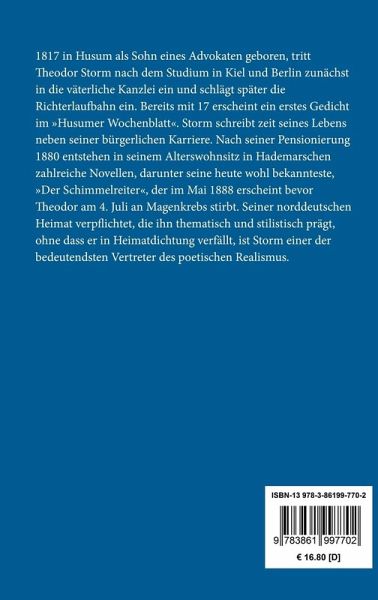 1817 in Husum als Sohn eines Advokaten geboren, tritt Theodor Storm nach dem Studium in Kiel und Berlin zunächst in die väterliche Kanzlei ein und schlägt später die Richterlaufbahn ein. Bereits mit 17 erscheint ein erstes Gedicht im "Husumer Wochenblatt". Storm schreibt zeit seines Lebens neben seiner bürgerlichen Karriere. Nach seiner Pensionierung 1880 entstehen in seinem Alterswohnsitz in Hademarschen zahlreiche Novellen, darunter seine heute wohl bekannteste, "Der Schimmelreiter", der im Mai 1888 erscheint bevor Theodor am 4. Juli an Magenkrebs stirbt. Seiner norddeutschen Heimat verpflichtet, die ihn thematisch und stilistisch prägt, ohne dass er in Heimatdichtung verfällt, ist Storm einer der bedeutendsten Vertreter des poetischen Realismus.