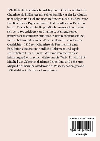1792 flieht der französische Adelige Louis Charles Adélaïde de Chamisso als Elfjähriger mit seiner Familie vor der Revolution über Belgien und Holland nach Berlin, wo Luise Friederike von Preußen ihn als Pagen annimmt. Erst im Alter von 15 Jahren lernt er Deutsch, tritt in die preußische Armee ein und nennt sich seit 1804 Adelbert von Chamisso. Während seines naturwissenschaftlichen Studiums in Berlin entsteht sein bei weitem bekanntestes Werk: "Peter Schlemihls wundersame Geschichte". 1815 reist Chamisso als Forscher mit einer Expedition zunächst ins nördliche Polarmeer und segelt schließlich mit um die ganze Welt und verarbeitet diese Erfahrung später in seiner "Reise um die Welt". Er wird 1819 Mitglied der Gelehrtenakademie Leopoldina und 1835 zum Mitglied der Berliner Akademie der Wissenschaften gewählt. 1838 stirbt er in Berlin an Lungenkrebs.
