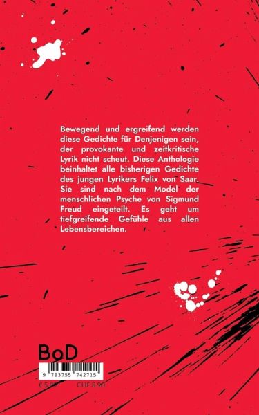 Bewegend und ergreifend werden diese Gedichte für Denjenigen sein, der provokante und zeitkritische Lyrik nicht scheut. Diese Anthologie beinhaltet alle bisherigen Gedichte des jungen Lyrikers Felix von Saar. Sie sind nach dem Model der menschlichen Psyche von Sigmund Freud eingeteilt. Es geht um tiefgreifende Gefühle aus allen Lebensbereichen.