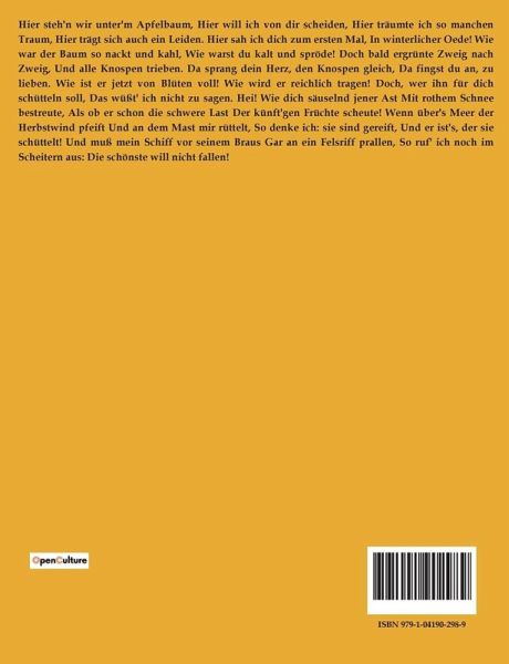 Hier steh'n wir unter'm Apfelbaum, Hier will ich von dir scheiden, Hier träumte ich so manchen Traum, Hier trägt sich auch ein Leiden. Hier sah ich dich zum ersten Mal, In winterlicher Oede! Wie war der Baum so nackt und kahl, Wie warst du kalt und spröde! Doch bald ergrünte Zweig nach Zweig, Und alle Knospen trieben. Da sprang dein Herz, den Knospen gleich, Da fingst du an, zu lieben. Wie ist er jetzt von Blüten voll! Wie wird er reichlich tragen! Doch, wer ihn für dich schütteln soll, Das wüßt' ich nicht zu sagen. Hei! Wie dich säuselnd jener Ast Mit rothem Schnee bestreute, Als ob er schon die schwere Last Der künft'gen Früchte scheute! Wenn über's Meer der Herbstwind pfeift Und an dem Mast mir rüttelt, So denke ich: sie sind gereift, Und er ist's, der sie schüttelt! Und muß mein Schiff vor seinem Braus Gar an ein Felsriff prallen, So ruf' ich noch im Scheitern aus: Die schönste will nicht fallen!
