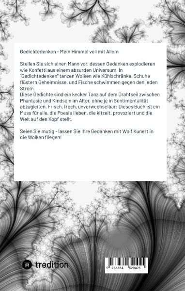 Entdecken Sie "Gedichtedenken - Mein Himmel voll mit Allem" - Ein Feuerwerk absurder PhantasieTauchen Sie ein in die Welt von "Gedichtedenken", einem einzigartigen Gedichtband, der die sprühenden Gedanken und skurrilen Phantasien eines Mannes einfängt, der im fortgeschrittenen Alter die Langsamkeit entdeckt. Dieses Buch ist kein sentimentaler Rückblick, sondern ein kühner Streifzug durch eine Fantasie, die Grenzen sprengt - absurd, lebendig und voller unerwarteter Begenungen.Warum "Gedichtedenken" ein Muss ist:- Jede Zeile überrascht mit bizarren Bildern und absurder Kreativität: - von tanzenden Kühlschränken bis zu rückwärtsschwimmenden Fischen.- Die Gedichte balancieren auf dem Drahtseil zwischen Wahn und Witz und Tiefgang ohne Schwere, ohne je rührselig oder langweilig zu wirken.- Ob Poesie-Liebhaber oder Neuling - die unkonventionellen Verse regen zum Schmunzeln und Nachdenken an - eine Inspiration für Jeden.Für wen ist dieses Buch?"Gedichtedenken" spricht alle an, die Freudean ungewöhnlicher Poesie haben. Es ist perfekt für Leser, die sich nach frischen, originellen Perspektiven im Alltag sehnen und die Absurdität des Lebens feiern möchten. Ideal für Fans von Lewis Carrolls lyrischem Stil oder Kafkaesker Surrealität, ohne deren Werke zu kopieren.Lassen Sie sich von diesem Autor zeigen, dass Phantasie keine Altersgrenze kennt. Tauchen Sie in eine Welt ein, in der Wolken zu Kühlschränken werden und Schuhe plötzlich Geschichten erzählen. Folgen Sie Wolf Kunert durch sein Poesie-Debüt und lassen Sie Ihre Gedanken im Klang seiner Skurilität tanzen!