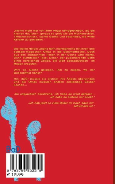 »Nichts mehr war von ihrer Angst übriggeblieben als ein kleines Häufchen, gerade so groß wie ein Mückenschiss.»Mücken-Schiss«, lachte Geena und beschloss, die wilde Abfahrt zu genießen.«Die kleine Heldin Geena fährt nichtsahnend mit ihren drei seltsam-magischen Omas in die Sommerfrische. Doch aus den entspannten Ferien in der Sonne wird nichts. Stattdessen lässt Donar, der pubertierende Sohn eines nordischen Gottes, die Welt förmlich im Regen ersaufen.Wird es Geena gelingen, ihm zu zeigen, wo der Dosenöffner hängt?Hm, dafür müsste sie erstmal ihre Ängste überwinden und die Omas müssten endlich anständige Zauber kochen...»So unglaublich berührend. Ich habe es nicht gelesen - ich habe es einfach nur erlebt.«»Ich hab jetzt so viele Bilder im Kopf, dass mir schwindelig ist«