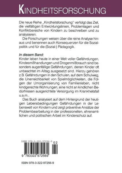 Gefährdungen von Kindern - Problemfelder und präventive Ansätze: Zur Einführung in dieses Buch.- Zur Einführung: Der Begriff der Prävention.- Prävention und Intervention am Beispiel von gesundheitlichen Beeinträchtigungen/psychosomatischen Beschwerden.- Drogengebrauch und Prävention: Von Problemen, die Kinder und Jugendliche im Umgang mit Drogen haben.- Schulorganisation als Faktor psychosozialer Belastung.- Wandel der Familie - Gefährdung für Kinder?.- Kindliche Probleme als Objekt psychotherapeutischer Intervention.- Kindesmißhandlung und Kinderschutz: Problemangemessene Hilfen zwischen karitativer Mildtätigkeit und fürsorglicher Belagerung.- Kinder und ihre Freunde - Kommunikation mit Gleichaltrigen und Erwachsenen.- Gesundheit und Gesundheitsförderung - Ein Überblick.- Die Rechtsstellung von Kindern/Jugendlichen im Rechtssystem der Bundesrepublik Deutschland.- Plädoyer für eine kommunalpolitische Intervention des Kinderschutzes.- Literatur.- Verzeichnis der Autoren.
