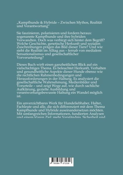 In diesem Buch geht es um sogenannte Kampfhunde und Hybridhunde - ihre Geschichte, Eigenschaften, rechtlichen Rahmenbedingungen sowie ihre gesellschaftliche Wahrnehmung. Es räumt mit Vorurteilen auf, informiert über Haltung, Gesundheit und Verhalten und liefert praktische Hilfestellungen für Halter, Fachleute und Interessierte. Durch fundierte Fakten, klare Sprache und kritische Analyse zeigt das Buch, wie ein verantwortungsvolles Zusammenleben zwischen Mensch und Hund gelingen kann. Ein umfassender Leitfaden für mehr Verständnis, Aufklärung und Fairness im Umgang mit oft missverstandenen Hunderassen.