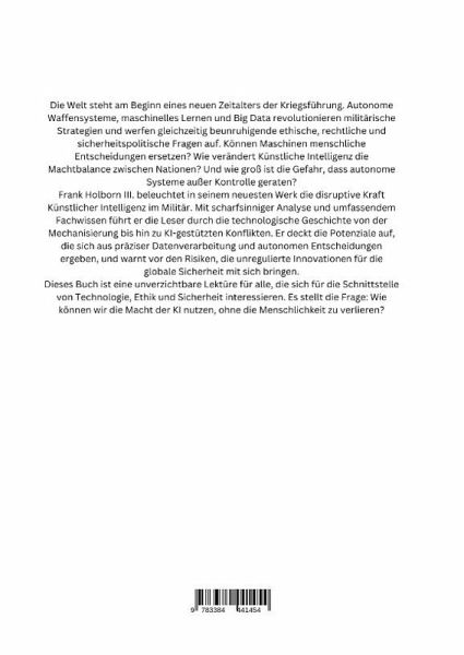 Die Welt steht am Beginn eines neuen Zeitalters der Kriegsführung. Autonome Waffensysteme, maschinelles Lernen und Big Data revolutionieren militärische Strategien und werfen gleichzeitig beunruhigende ethische, rechtliche und sicherheitspolitische Fragen auf. Können Maschinen menschliche Entscheidungen ersetzen? Wie verändert Künstliche Intelligenz die Machtbalance zwischen Nationen? Und wie groß ist die Gefahr, dass autonome Systeme außer Kontrolle geraten?Frank Holborn III. beleuchtet in seinem neuesten Werk die disruptive Kraft Künstlicher Intelligenz im Militär. Mit scharfsinniger Analyse und umfassendem Fachwissen führt er die Leser durch die technologische Geschichte von der Mechanisierung bis hin zu KI-gestützten Konflikten. Er deckt die Potenziale auf, die sich aus präziser Datenverarbeitung und autonomen Entscheidungen ergeben, und warnt vor den Risiken, die unregulierte Innovationen für die globale Sicherheit mit sich bringen.Dieses Buch ist eine unverzichtbare Lektürefür alle, die sich für die Schnittstelle von Technologie, Ethik und Sicherheit interessieren. Es stellt die Frage: Wie können wir die Macht der KI nutzen, ohne die Menschlichkeit zu verlieren?