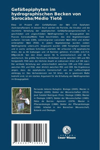 Etwa 10 Prozent aller Gefäßpflanzen der Welt sind Epiphyten (Aufsitzerpflanzen). In diesem Buch werden die Floristik, die Struktur und die räumliche Verteilung der epiphytischen Gefäßpflanzengemeinschaft in geschützten und ungeschützten Waldfragmenten im Einzugsgebiet des Flusses Sorocaba/Médio Tietê beschrieben, das drei Vegetationstypen aufweist: Cerrado (CER), sommergrüner saisonaler Wald (FES) und dichter ombrophiler Wald (FOD). In jedem Vegetationstyp wurden sieben Waldfragmente untersucht. Insgesamt wurden 1080 Forophyten bewertet und in sechs vertikale Schichten unterteilt. Wir erfassten 176 epiphytische Arten, die zu 66 Gattungen und 14 Familien gehören; H'=3,695; J=0,713; DMg=18,39. Von den Arten waren 56 % anemochorisch und 44 % zoochorisch. Die größte floristische Ähnlichkeit wurde zwischen CER und FES festgestellt; FOD wies die höchste Anzahl an exklusiven Arten auf (94 spp.). Die vertikale Verteilung war unterschiedlich zwischen CER und FOD sowie zwischen FES und FOD, aber ähnlich zwischen FES und CER. Die Ergebnisse zeigen, dass die epiphytische Gemeinschaft von der Luftfeuchtigkeit abhängig ist. Das Vorhandensein von 50 Arten, die in gewissem Maße bedroht sind, ist ein starkes Argument für die Erhaltung von Waldfragmenten im Einzugsgebiet.