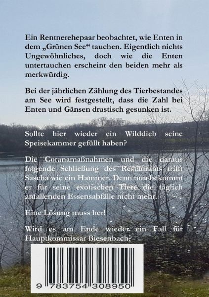 Ein Rentnerehepaar beobachtet, wie Enten in dem "Grünen Seetauchen". Eigentlich nichts Ungewöhnliches, doch wie die Enten untertauchen erscheint den beiden mehr als merkwürdig. Bei der jährlichen Zählung des Tierbestandes am See wird festgestellt, dass die Zahl bei Enten und Gänsen drastisch gesunken ist.Sollte hier wieder ein Wilddieb seine Speisekammer gefüllt haben?Die Coronapandemie und die daraus folgende Schließung des Restaurants trifft Sascha wie ein Hammer. Denn nun bekommt er für seine exotischen Tiere die täglich anfallenden Essensabfälle nicht mehr. Eine Lösung muss her!Wird es am Ende wieder ein Fall für Hauptkommissar Biesenbach?