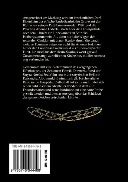 Ausgerechnet am Markttag wird im beschaulichen Dorf Eibenheim der elfische Barde Scarlok der Grüne auf der Bühne vor seinem Publikum ermordet. Während die Paladina Arienna Federfall noch über die Hintergründe nachdenkt, bricht ein Unbekannter in Scarloks Herbergszimmer ein. Als dann noch die Wagen der reisenden Gaukler, mit denen Scarlok durch die Lande reist, in Flammen aufgehen, steht für Arienna schnell fest, dass hinter der Tat mehr steckt als nur ein düpierter Fürst. Ein Brief aus dem Besitz Scarloks weist gar auf Zusammenhänge zur elfischen Kirche hin, mit der Arienna eng verbunden ist.Gemeinsam mit zwei Veteraninnen des vergangenen Elfenkriegs, der Zentaurin Fiorella Donnerhuf und der Satyra Norska Feuerblut, sowie der satyrischen Heilerin Kassandra Albtraumkind nimmt sie die beschwerliche Reise in die Hauptstadt Silberfall auf sich - und findet sich schon bald in einem Abenteuer wieder, in dem alte Freundschaften und neue Bündnisse auf eine harte Probe gestellt werden undüber das Schicksal des ganzen Reiches entscheiden könnten ...