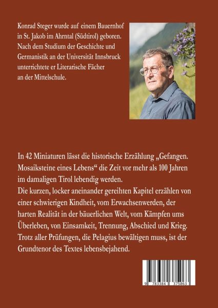 In 42 kurzen Textabschnitten lässt die historische Erzählung "Gefangen. Mosaiksteine eines Lebens" die Zeit vor mehr als 100 Jahren im damaligen Tirol lebendig werden. Die kurzen, locker aneinander gereihten Kapitel erzählen von der schwierigen Kindheit des ledigen Kindes Pelagius, vom Erwachsenwerden, der harten Realität in einer bäuerlichen Welt, vom Kämpfen ums Überleben, von Einsamkeit, Trennung, Abschied und Krieg. Trotz aller Schwierigkeiten und Prüfungen, die Pelagius bewältigen muss, ist der Grundtenor des Textes lebensbejahend.