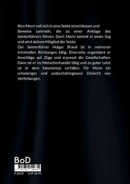 Band 3 - Privatdetektiv Rico Monn ermittelt:Rico Monn soll sich in eine Sekte einschleusen und Beweise sammeln, die zu einer Anklage des Sektenführers führen. Doch Monn kommt in einen Sog und wird aktives Mitglied der Sekte.Der Sektenführer Holger Brand ist in mehreren kriminellen Richtungen tätig. Einerseits organisiert er Anschläge auf Züge und erpresst die Gesellschaften. Dann ist er im Menschenhandel tätig und zu guter Letzt ist er dem Satanismus verfallen. Für Monn ein schwieriges und undurchdringbares Dickicht von Verfehlungen.
