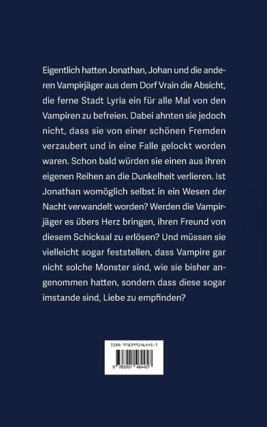 Eigentlich hatten Jonathan, Johan und die anderen Vampirjäger aus dem Dorf Vrain die Absicht, die ferne Stadt Lyria ein für alle Mal von den Vampiren zu befreien. Dabei ahnten sie jedoch nicht, dass sie von einer schönen Fremden verzaubert und in eine Falle gelockt worden waren. Schon bald würden sie einen aus ihren eigenen Reihen an die Dunkelheit verlieren. Ist Jonathan womöglich selbst in ein Wesen der Nacht verwandelt worden? Werden die Vampirjäger es übers Herz bringen, ihren Freund von diesem Schicksal zu erlösen? Und müssen sie vielleicht sogar feststellen, dass Vampire gar nicht solche Monster sind, wie sie bisher angenommen hatten, sondern dass diese sogar imstande sind, Liebe zu empfinden?