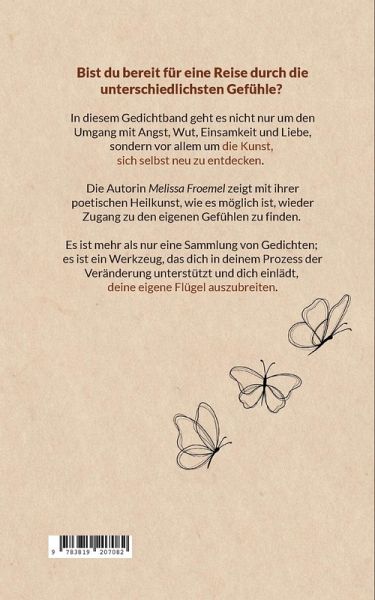 Bist du bereit für eine Reise durch die unterschiedlichsten Gefühle? In diesem Gedichtband geht es nicht nur um den Umgang mit Angst, Wut, Einsamkeit und Liebe, sondern vor allem um die Kunst, sich selbst neu zu entdecken. Die Autorin Melissa Froemel zeigt mit ihrer poetischen Heilkunst, wie es möglich ist, wieder Zugang zu den eigenen Gefühlen zu finden. Es ist mehr als nur eine Sammlung von Gedichten; es ist ein Werkzeug, das dich auf deinem Weg der Veränderung begleitet und dich einlädt, deine eigenen Flügel auszubreiten.