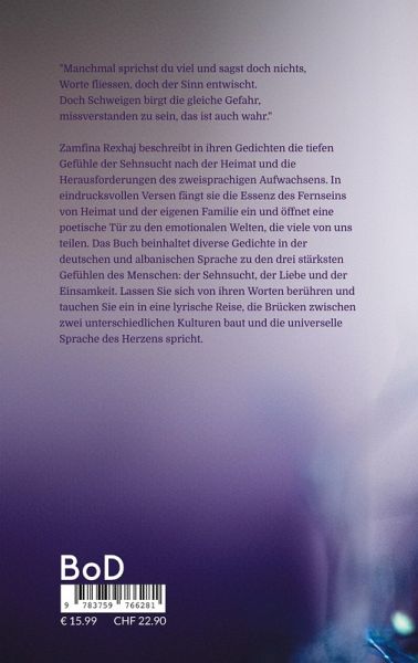Manchmal sprichst du viel und sagst doch nichts, Worte fliessen, doch der Sinn entwischt. Doch Schweigen birgt die gleiche Gefahr, Missverstanden zu sein, das ist auch wahr. Zamfina Rexhaj beschreibt in ihren Gedichten die tiefen Gefühle der Sehnsucht nach der Heimat und die Herausforderungen des zweisprachigen Aufwachsens. In eindrucksvollen Versen fängt sie die Essenz des Fernseins von Heimat und der eigenen Familie ein und öffnet eine poetische Tür zu den emotionalen Welten, die viele von uns teilen. Das Buch beinhaltet diverse Gedichte in der deutschen und albanischen Sprache zu den drei stärksten Gefühlen des Menschen: der Sehnsucht, der Liebe und der Einsamkeit. Lassen Sie sich von ihren Worten berühren und tauchen Sie ein in eine lyrische Reise, die Brücken zwischen zwei unterschiedlichen Kulturen baut und die universelle Sprache des Herzens spricht.