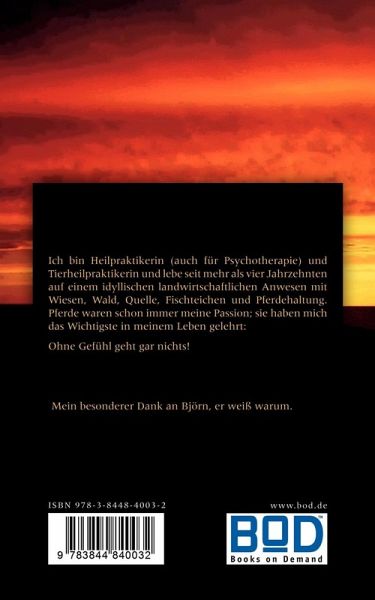 Ich bin Heilpraktikerin (auch für Psychotherapie) und Tierheilpraktikerin und lebe seit mehr als vier Jahrzehnten auf einem idyllischen landwirtschaftlichen Anwesen mit Wiesen, Wald, Quelle, Fischteichen und Pferdehaltung. Pferde waren schon immer meine Passion; sie haben mich das Wichtigste in meinem Leben gelehrt: Ohne Gefühl geht gar nichts!Mein besonderer Dank an Björn, er weiß warum.