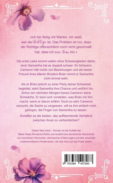 »Ich bin fertig mit Warten. Ich weiß, wer der Richtige ist. Das Problem ist nur, dass der Richtige offensichtlich noch nicht geschnallt hat, dass ich eine Frau bin.«Die erste Liebe kommt selten ohne Schwierigkeiten daher, doch Samantha hat es doppelt schwer: Ihr Schwarm Cameron hält nichts von Beziehungen und als bester Freund ihres älteren Bruders Brian nimmt er Samantha nicht einmal wahr.Als er Brian jedoch zu einer Party seiner Schwester begleitet, sieht Samantha ihre Chance und verführt ihn. Schon am nächsten Morgen bereut Cameron seine Schwäche. Er kann sich vorstellen, was Brian mit ihm macht, wenn er davon erfährt. Doch so sehr Cameron versucht, die Sache zu vergessen, will es ihm einfach nicht gelingen, die Finger von Samantha zu lassen.Schaffen es die beiden, das aufflammende Verhältnis zwischen ihnen zu verheimlichen?Dieser New Adult - Roman ist der Auftakt der Black-Swan-Romance-Reihe und erzählt eine berührende Geschichte von heimlichen Wünschen, stürmischen Erfahrungen und den scheinbar unüberwindbaren Hindernissen, die das Herz auf die Probe stellen.