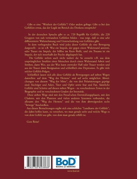 Gibt es eine "Weisheit der Gefühle"? Oder anders gefragt: Gibt es bei den Gefühlen etwas, das der Logik im Bereich des Denkens entspricht?Man kann sich dem zumindest annähern. In der deutschen Sprache gibt es ca. 720 Begriffe für Gefühle, die 220 Gruppen von sehr ähnlichen Gefühlen bilden - was zeigt, dass es eine sehr differenzierte Wahrnehmung und Unterscheidung von Gefühlen gibt.In dem vorliegenden Buch wird jedes dieser Gefühle als eine Bewegung dargestellt - so ist z.B. Wut ein Impuls, der gegen einen Widerstand anrennt, oder Trauer ein Impuls, der hilflos im Kreis fließt, und ein Trauma ein Impuls, der sich innerhalb der Psyche abgekapselt hat.Die Gefühle stehen auch nicht isoliert da: So entsteht z.B. aus dem ursprünglichen Strahlen eines Menschen durch einen Widerstand Arbeit und Streben, dann Wut, aus der Wut entweder Hass oder Trauer und aus der Trauer dann Resignation und schließlich eine Depression. Es gibt viele solcher Gefühls-Folgen.Schließlich lassen sich alle diese Gefühle als Bewegungen auf sieben Wegen darstellen: auf dem "Weg des Herzens" und auf sechs möglichen Abweichungen von diesem "Weg der Mitte", die von drei Polarisierungen geprägt sind: Süchtiger und Asket, Täter und Opfer sowie Star und Fan. Sämtliche Gefühle sind Schritte auf diesen sieben Wegen - zu verschiedenen Zeiten in der Biographie und in verschiedenen Graden der Intensität.Diese sieben Wege sind mit den Freud'schen Entwicklungsphasen, mit den Chakren, mit den Planeten und vielen anderen Systemen verbunden.Aus diesen Betrachtungen ergibt sich eine schlichte "Landkarte der Gefühle", die dabei helfen kann, zu verstehen, wo man gerade steht und welche Wege es von dem Gefühl aus gibt, von dem man gerade erfüllt ist.Gute Reise!