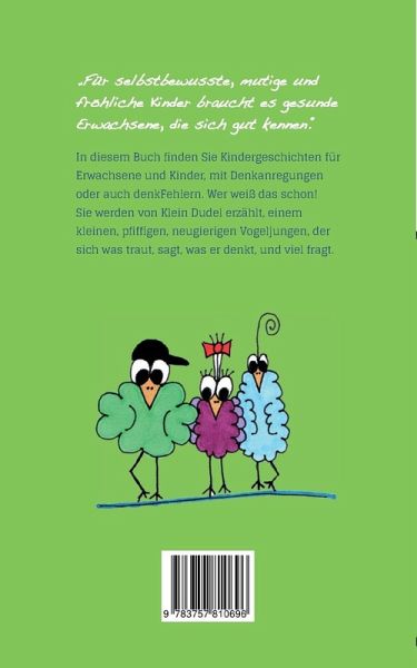 "Für selbstbewusste, mutige und fröhliche Kinder braucht es gesunde Erwachsene, die sich gut kennen."In diesem Buch finden Sie Kindergeschichten für Erwachsene und Kinder, mit Denkanregungen oder auch denkFehlern. Wer weiß das schon! Sie werden von Klein Dudel erzählt, einem kleinen, pfiffigen, neugierigen Vogeljungen, der sich was traut, sagt, was er denkt, und viel fragt.Mit 99,9 farbigen IllustrationenGefühlsdudelzwei erscheint September 2023