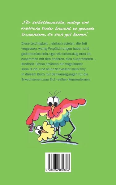 GefühlsdudelzweiDiese Leichtigkeit ... einfach spielen, die Zeit vergessen, wenig Verpflichtungen haben und gedankenlos sein, egal wie schmutzig man ist, zusammen mit den anderen, sich ausprobieren ... Kindheit. Davon erzählen die Vogelkinder klein Dudel und seine Schwester klein Tilly in diesem Buch mit Denkanregungen für die Erwachsenen zum Sich-selber-Kennenlernen.