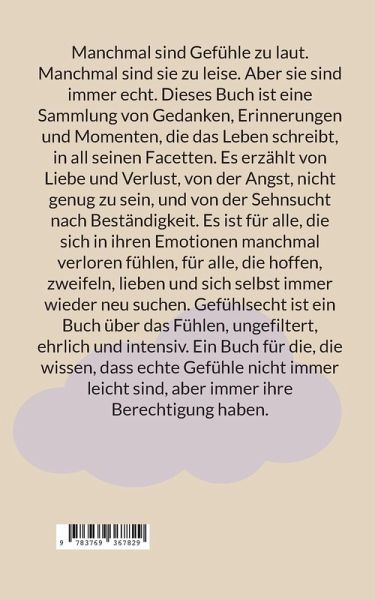 Manchmal sind Gefühle zu laut. Manchmal sind sie zu leise. Aber sie sind immer echt. Dieses Buch ist eine Sammlung von Gedanken, Erinnerungen und Momenten, die das Leben schreibt, in all seinen Facetten. Es erzählt von Liebe und Verlust, von der Angst, nicht genug zu sein, und von der Sehnsucht nach Beständigkeit. Es ist für alle, die sich in ihren Emotionen manchmal verloren fühlen, für alle, die hoffen, zweifeln, lieben und sich selbst immer wieder neu suchen. Gefühlsecht ist ein Buch über das Fühlen, ungefiltert, ehrlich und intensiv. Ein Buch für die, die wissen, dass echte Gefühle nicht immer leicht sind, aber immer ihre Berechtigung haben.