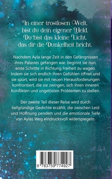 Nachdem Ayla lange Zeit in den Gefängnissen ihres Palastes gefangen war, beginnt sie nun, erste Schritte in Richtung Freiheit zu wagen. Indem sie sich endlich ihren Gefühlen öffnet und sie spürt, wird sie mit neuen Herausforderungen konfrontiert, die sie zwingen, sich ihren inneren Konflikten und ungelösten Problemen zu stellen. Der zweite Teil dieser Reise wird durch tiefgründige Gedichte erzählt, die zwischen Leid und Hoffnung pendeln und die emotionale Tiefe von Aylas Weg eindrucksvoll widerspiegeln.